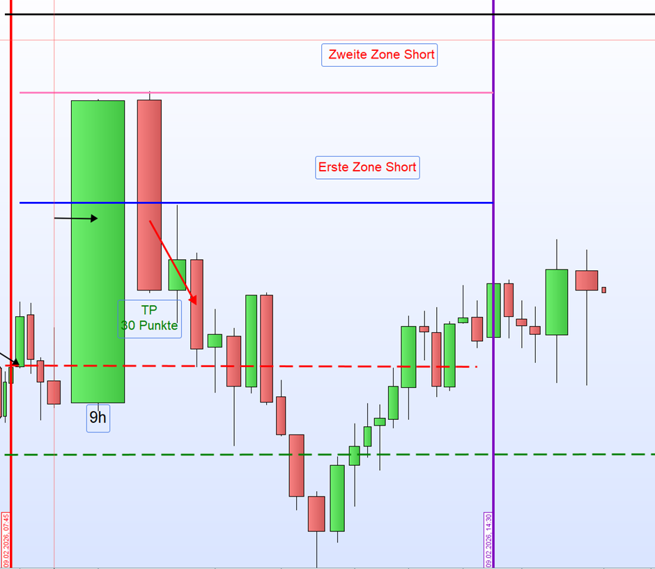 Im Morgenhandel sollte der Fokus zunächst ausschließlich auf den zweiten Zonen liegen. Diese stellen erfahrungsgemäß die statistisch stabilsten Einstiegsbereiche dar und bieten die größte Sicherheit in der Umsetzung. Hier geht es nicht um Trade-Häufigkeit, sondern um das saubere Erlernen von Zonenlogik, Geduld und regelkonformer Positionsführung.